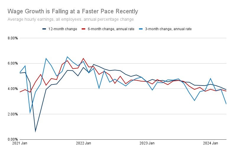 Average hourly earnings for all workers grew by 3.9% over the past year, down from 4.1% last month and far from its post-pandemic peak of 5.9%. Wage growth has been on a slow but steady glide path down since it peaked in 2022, but the slowdown has been sharper in recent months: pay gains over the past three months have come in at an annual rate of 2.8%, the smallest growth rate at any point since the pandemic. These cooling wage dynamics should make policymakers more comfortable that wage growth will not stoke further inflation in the near term.