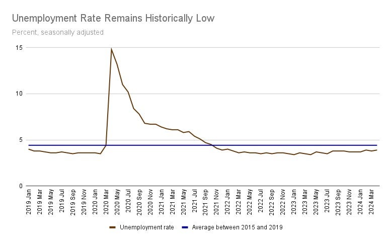 The unemployment rate rose to 3.9% in April, returning back to its February level after falling to 3.8% in March. This rate has remained within a narrow (and historically low) range of 3.7-3.9% since August. While these recent numbers are a shift up from the post-pandemic low of 3.4% seen a year ago, April’s number marks the 27th month the unemployment rate has remained below 4% – a sign that workers who have lost their jobs or people just entering the labor force are still having a relatively easy time finding employment.