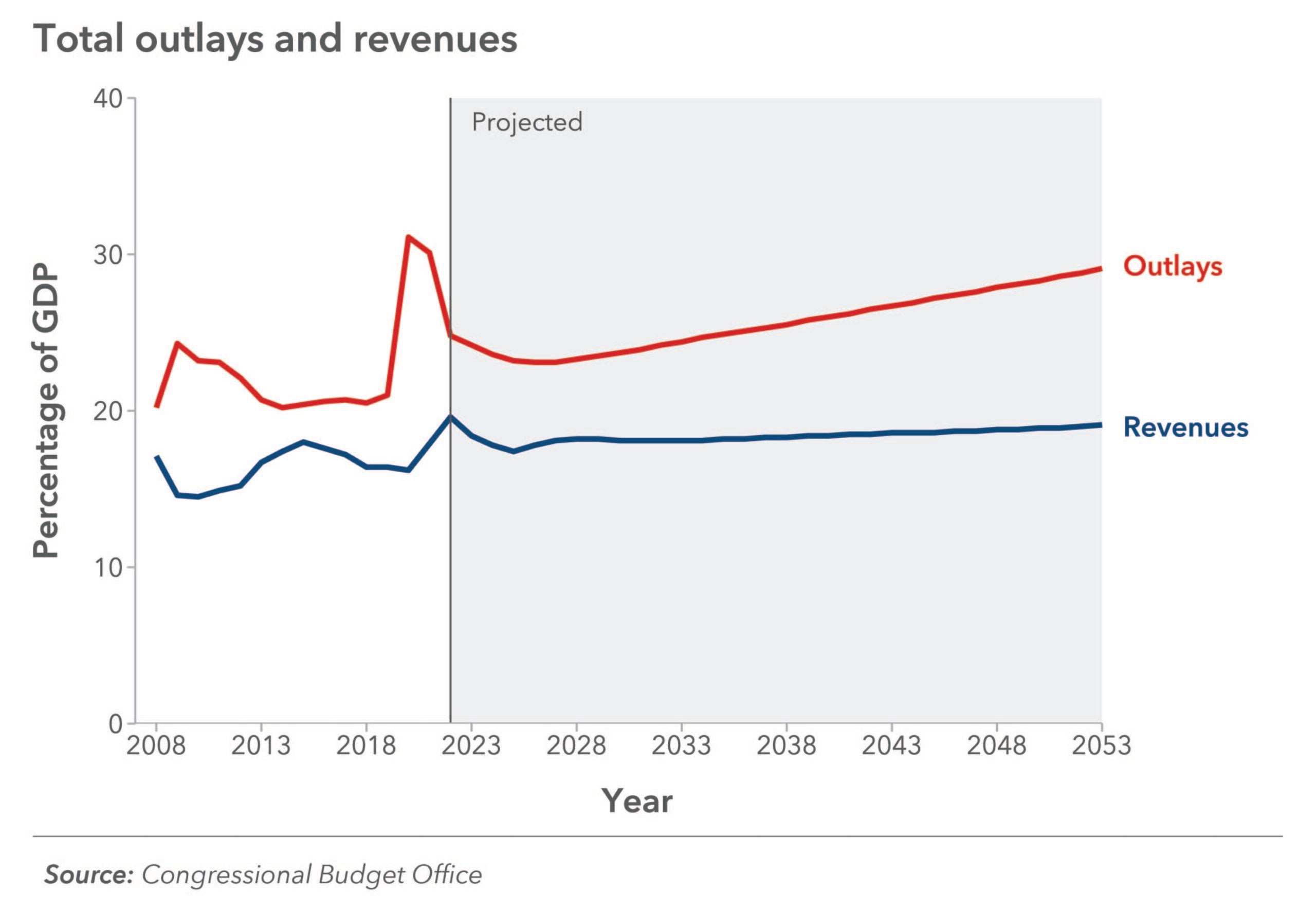 November 08 2023 | Figures Figure 2(a): CBO Projections for Federal Spending and Revenues, 2008–2053 Melissa S. Kearney , Luke Pardue Recent Resources December 04 2025 | Papers Coverage Isn’t Care: An Abundance Agenda for Medicaid Originally a small, inexpensive safety-net program, Medicaid has grown into a major national health-insurance provider, covering nearly one in four… Craig Garthwaite , Timothy Layton November 19 2025 | Papers An Energy Strategy for National Renewal After two decades of relatively constant energy consumption, the nation faces a surge in power demand driven by artificial intelligence,… Joseph Majkut November 12 2025 | Papers Improving Housing Affordability Housing affordability in the United States has become a major challenge for Americans and a key policy priority for US… Benjamin Keys , Vincent Reina