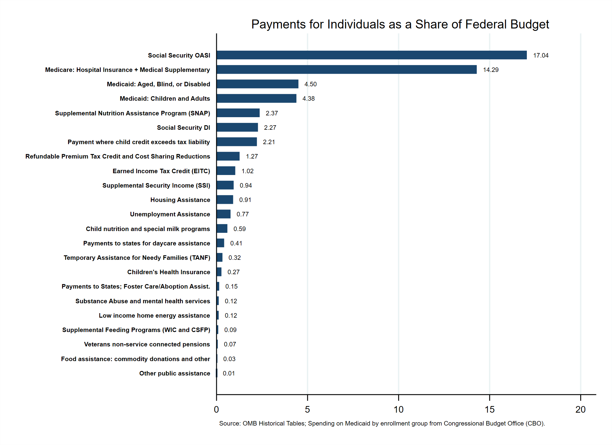 - The share of government spending on children stands in contrast with the share of resources devoted to older age Americans. Social Security and Medicare, which provide cash benefits and health insurance to the elderly, comprise a large share of federal government spending. Combined, the Social Security Old Age & Survivors Insurance and Medicare programs comprised 31.3% of federal outlays in 2022, providing benefits to 57 million and 65 million recipients, respectively. Spending on these programs is expected to rise further as a larger share of the country’s population enters retirement age. Absent significant reforms or benefit cuts, these two programs are projected to reach a combined 39.3% of outlays by 2028. On the other hand, the share of federal outlays for individuals excluding Social Security and Medicare is estimated to fall by more than half to 16.5% of all spending by 2028. If policymakers intend to address the budget deficit by reining in spending on individuals, these two programs are the place where there is the potential for meaningful reductions in budget outlays, and they could pursue spending cuts on these programs that maintain the distributional goals of progressivity and have negligible effects on human capital development and economic growth.