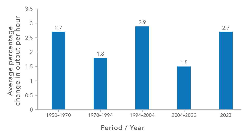 Economist Robert Gordon has documented that the United States enjoyed a “special century” of productivity growth from just around the Civil War until the 1970s. Innovations during that time—including electricity, railroads, and the automobile—dramatically raised the productive capacity of US businesses. During the tail end of that century, from 1950 to 1970, worker productivity was growing at an average annual rate of 2.7 percent. Since then, the economy has experienced three distinct phases of productivity growth: a slowdown in the quarter-century from 1970 to 1994, when growth averaged 1.8 percent; a decade of faster growth from 1994 to 2004, when the internet revolution sped business productivity growth to a 2.9 percent rate; and finally a return to slower growth of 1.5 percent from 2004 to 2022. In the four quarters of 2023, however, productivity growth has experienced a renewed surge, averaging 2.7 percent—equal or similar to those prior waves of productivity growth.