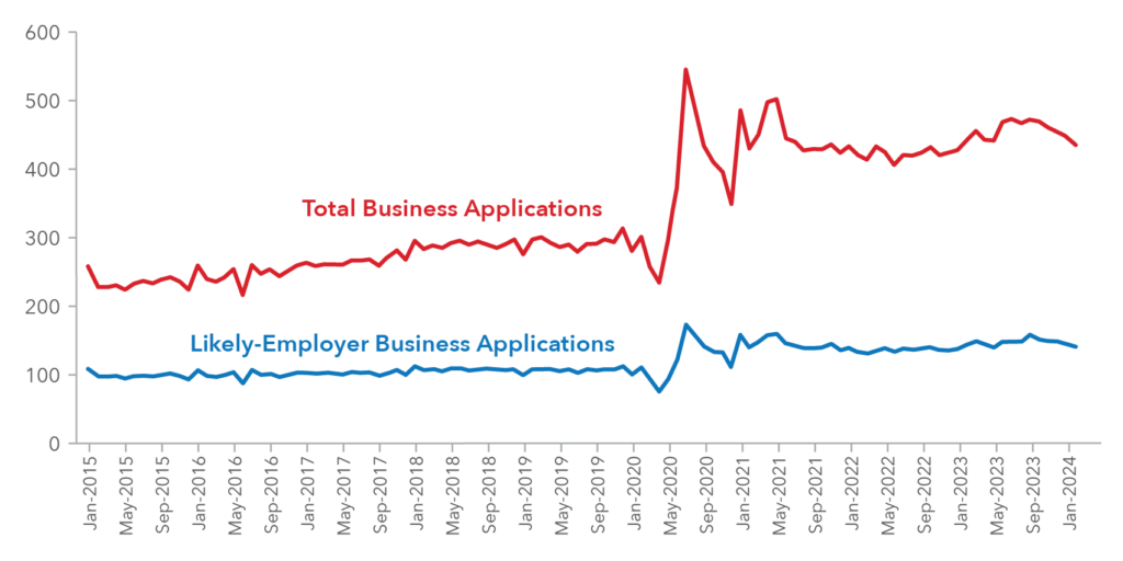 Figure 2: Monthly number of business applications, in thousands, seasonally adjusted, January 2015–January 2024
