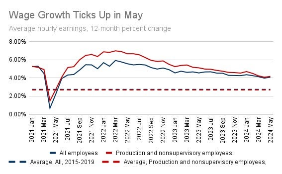 As the job market continues to expand, firms increased wages faster than expected in May as well. Average hourly earnings for all workers grew by 4.1% over the past year, an uptick from the 3.9% rate of growth last month. This uptick is small in comparison to the large decline in wage growth we have seen since 2022 when pay was rising at a 5.9% pace. But the jump is also a sign that the job market is still strong and is driving pay increases that, in turn, are making it less likely inflation will quickly fall.