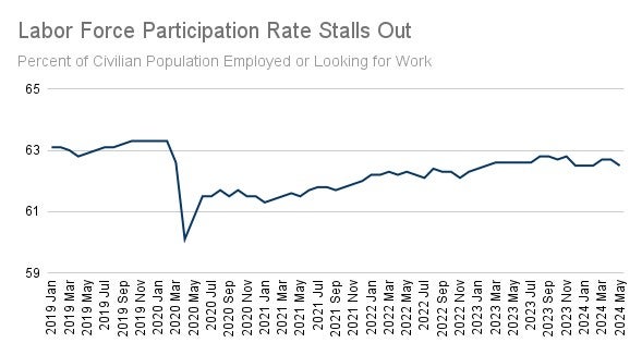 Although the top-line estimates of employment and wage growth pointed to a still stronger-than-expected job market. The May jobs report did flash some warning signs that the job market may be slowing down. First, the unemployment rate hit 4% for the first time since January 2022, when it was falling from the pandemic-induced highs. This share of adults looking for work but unable to find a job has been slowly but steadily rising from the post-pandemic low of 3.4% in recent months. Second, the unemployment rate can sometimes rise for a good reason – because more adults start to look for work – but this was not one of those times. The labor force participation rate fell from 62.7% to 62.5% in May and has been stuck well below pre-pandemic levels for the past four years. These twin trends – of a smaller share of adults looking for work and, when they are, having a harder time finding jobs – will make it difficult for the economy to continue growing as quickly as it has recently.