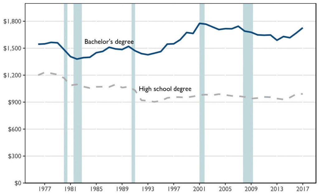 In addition to growing gaps in employment rates, there are large earnings gaps between those with and without a college degree. In 2017, workers with a college degree earned nearly two thirds more than workers without a college degree. As Figure 1 demonstrates, the earnings gap in weekly earnings between workers with a college degree and those with a high school degree increased substantially in the latter half of the 20th century, and that gap remains large. Increasing the number of Americans with a college degree would advance both individual economic security and the productivity and competitiveness of the American economy more broadly.