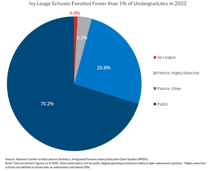 The most recent data collected by the US Department of Education indicate that the eight Ivy League schools accounted for less than 1 percent of total undergraduate enrollment in Fall of 2022. A far greater share of students are served by other private (non-for profit) institutions (25.6%), and 70.2% undergraduate students are enrolled in a public college or university.